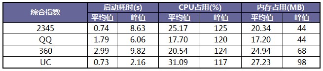 據(jù)權(quán)威部門最新發(fā)布的《安卓手機(jī)瀏覽器性能對比測試報告》中指出,對于當(dāng)前120余款熱門機(jī)型在安裝、卸載、啟動、運(yùn)行APP的測試反應(yīng)中,2345手機(jī)瀏覽器在啟動耗時、CUP占用、內(nèi)存占用等方面的表現(xiàn)較為突出。從2345和QQ、360及UC的綜合對比數(shù)據(jù)來看,2345手機(jī)瀏覽器的啟動耗時明顯低于QQ和360,內(nèi)存占用率位居第二,僅次于QQ。
