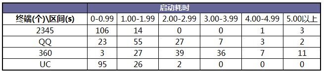 從啟動耗時來看,2345手機(jī)瀏覽器的啟動耗時區(qū)間大致在0-1.99秒,平均啟動耗時略遜于UC,但遠(yuǎn)遠(yuǎn)優(yōu)于QQ和360的啟動耗時。而且測試表現(xiàn),2345和UC的啟動耗時在各機(jī)型上表現(xiàn)波動不大,非常穩(wěn)定。