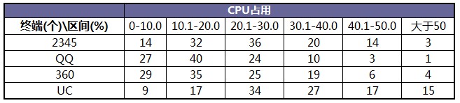 從CPU占用百分比來看,2345手機(jī)瀏覽器的占用率大致在10%-40%之間,相對于QQ和360的占用率較高一些。而UC的CPU占用率最高,其CPU占用率超過50%的機(jī)型多達(dá)15款,占所有機(jī)型的12.5%。