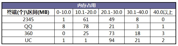 在內(nèi)存占用方面,由于UC和360內(nèi)存占用30M以上的機(jī)型比較多,拉高了整體數(shù)據(jù),所以對比結(jié)果中QQ占用內(nèi)存最少,2345次之,360隨后,UC最大。