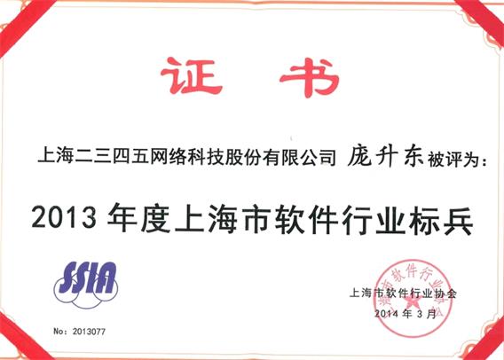 2014年3月26日下午,上海市軟件行業(yè)協(xié)會2014年工作年會暨“上海市軟件行業(yè)標兵&軟件行業(yè)服務明星”評選活動頒獎典禮在上海市經(jīng)濟管理干部學院禮堂舉行。上海市經(jīng)信委、科委、發(fā)改委、商務委等相關部門負責人,相關產(chǎn)業(yè)園區(qū)(基地)、行業(yè)協(xié)會、軟件企業(yè)負責人及十余家媒體記者,約300人到會。本次評選活動中二三四五董事長龐升東獲得軟件行業(yè)標兵稱號,二三四五軟件研發(fā)中心李春志獲得軟件服務明星稱號。