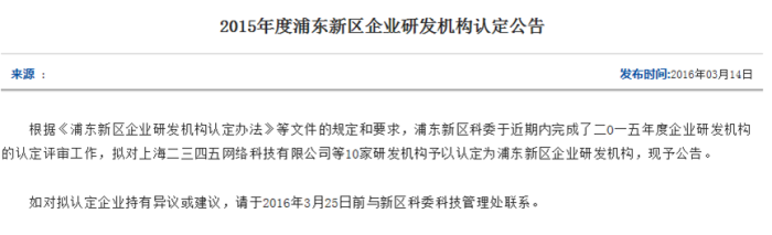 3月14日,上海市浦東新區(qū)科學技術委員會正式公示“2015年度企業(yè)研發(fā)機構”認定名單,上海二三四五網(wǎng)絡科技有限公司(簡稱“2345.com”)等10家研發(fā)機構榜上有名。