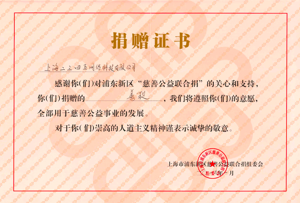 作為高橋鎮(zhèn)重點互聯(lián)網(wǎng)企業(yè),二三四五自13年開始連續(xù)多年參加高橋鎮(zhèn)“聯(lián)合公益捐“活動,為高橋鎮(zhèn)慈善事業(yè)做出突出貢獻(xiàn)。先后數(shù)次獲得上海市高橋鎮(zhèn)政府頒發(fā)的感動高橋、高橋鎮(zhèn)經(jīng)濟建設(shè)突出貢獻(xiàn)獎等榮譽。