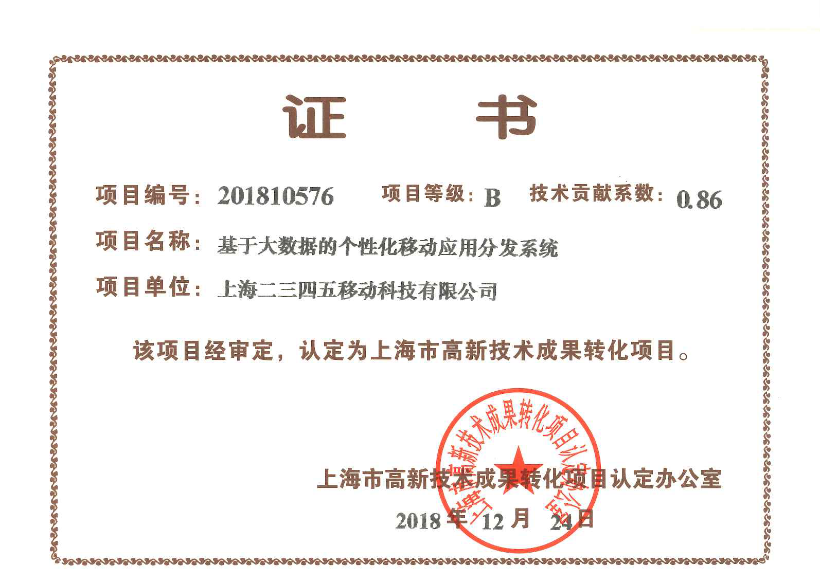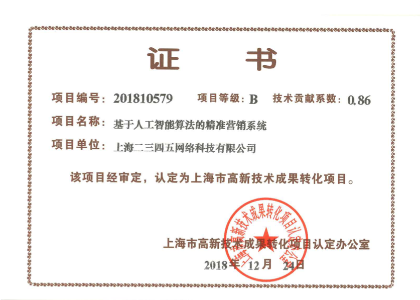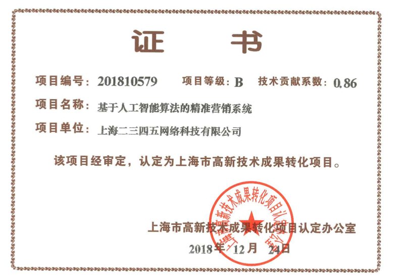 近日,上?;ヂ?lián)網(wǎng)巨頭、中國互聯(lián)網(wǎng)百強(qiáng)企業(yè)二三四五,再獲兩項(xiàng)上海市高新技術(shù)成果轉(zhuǎn)化認(rèn)證,分別為上海二三四五網(wǎng)絡(luò)科技有限公司的“基于人工智能算法的精準(zhǔn)營銷系統(tǒng)”和上海二三四五移動科技有限公司的“基于大數(shù)據(jù)的個性化移動應(yīng)用分發(fā)系統(tǒng)”。本次公布的上海高新技術(shù)轉(zhuǎn)化成果認(rèn)證的企業(yè)還包括中國石化在內(nèi)的其他共計(jì)70個項(xiàng)目。