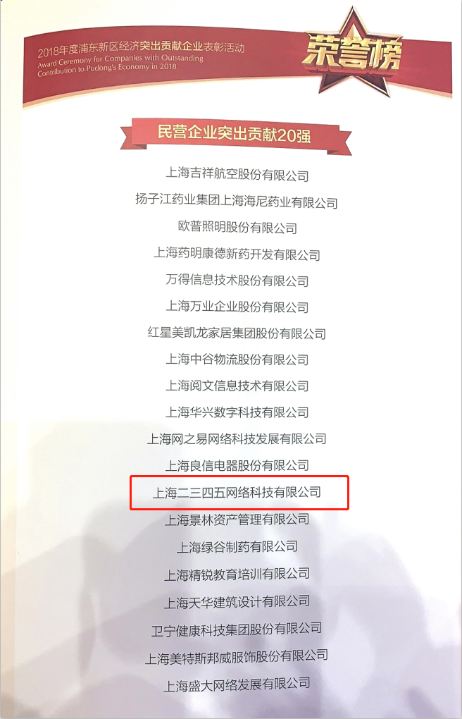 4月2日,由上海市浦東新區(qū)人民政府主辦的“2018年度浦東新區(qū)經(jīng)濟突出貢獻企業(yè)表彰活動”在滬隆重舉行,浦東新區(qū)區(qū)委、區(qū)政府、區(qū)人大和區(qū)政協(xié)的領(lǐng)導(dǎo)悉數(shù)出席。會上,上海二三四五網(wǎng)絡(luò)科技有限公司(以下簡稱“二三四五”)憑借在互聯(lián)網(wǎng)科技方面的不懈努力,榮獲“2018年度浦東新區(qū)民營企業(yè)突出貢獻獎20強”,二三四五副總裁羅繪代表企業(yè)上臺領(lǐng)獎。