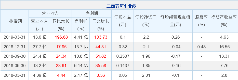 二三四五4月18日最新公布的2019年一季報顯示,其營業(yè)收入13.0億元,同比增長196.68%;歸屬于上市公司股東的凈利潤4.41億元,同比增長103.73%?;久抗墒找?.1元。