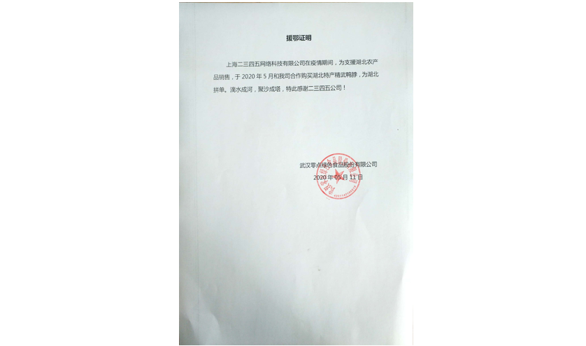 為了貢獻出自己的一份力量,把援鄂好事辦實,二三四五成立專門小組,積極聯(lián)系湖北當?shù)睾献魃纭⒐S等,采購了精武鴨脖、秭歸倫晚橙、爽露爽米釀、孝感麻糖、熱干面等一大批具有湖北特色產(chǎn)品,為當?shù)仄髽I(yè)、合作社解決實際問題,精準援鄂助農(nóng)。