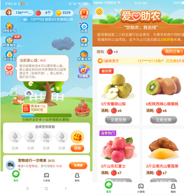 以最受用戶歡迎的核心助農(nóng)游戲產(chǎn)品 “星球果園”為例,“星球果園”是一款典型的虛擬農(nóng)場(chǎng)產(chǎn)品,用戶通過(guò)在產(chǎn)品頁(yè)面種下樹(shù)苗后,完成平臺(tái)制定的相應(yīng)“小任務(wù)”,如每天簽到、給寵物喂食、瀏覽指定頁(yè)面、看新聞、看視頻等方式,即可獲得不等量的水滴獎(jiǎng)勵(lì),并用水滴澆灌樹(shù)苗,使其成長(zhǎng)為果樹(shù),完成任務(wù)后最終可免費(fèi)兌換實(shí)物水果,平臺(tái)包郵送到家。